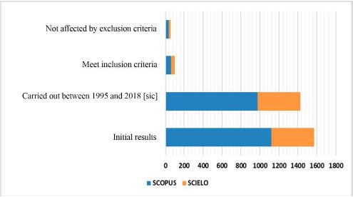 Figures 2 and 3 show the results of the systematic search in the databases used. As indicated in figure 1, 1122 articles were found in Scopus and 449 in SciELO, that is, a total of 1571 articles adding up the results from the two databases. This number reduced to 54 and 38 once the inclusion criteria had been validated and successively to 40 and 17, respectively, after verification of the exclusion criteria, for a total of 57 articles. Of these, 9 determined the lead level in blood in populations of children and adults (15 %), 1 in objects (2 %), 14 in food (23 %), 8 in soil (13 %), 9 in bioindicators (17 %), 5 in air (9 %), and 11 in water (21 %), as presented in figure 3.