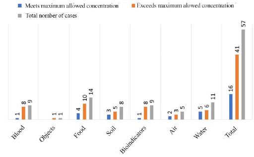 The table above shows reports of specific cases, so it cannot be assumed they are generalizable to the country. Even so, it should cause alarm that 41 of the 57 reported cases, that is, 72 %, show lead concentrations above the norm. These percentages, as summarized in figure 4, amount to 89 % for blood samples in adults and children, 71 % for food, 63 % for soil, 89 % for bioindicators, 60 % for air and 55 % for water. It can be noticed that the maximum values in most cases exceeded the acceptable levels, evidencing a greater risk of poisoning in activities related to battery recycling, consumption of contaminated food, ingestion of paint particles, and projectiles lodged in the human body. This situation is aggravated by a lack of regulations in the country related to environmental exposure to lead.