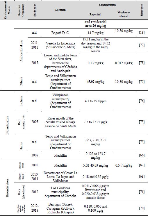 In this case, exposure to lead associated with the ingestion of food contaminated by contact with solid waste with concentrations between 2.86 and 9624 mg/kg is evidenced in the Morro de Moravia open-air landfill in the city of Medellín. Likewise, animal species that inhabit this place such as different arachnids and the house mouse (Mus musculus) presented average levels of 5.01 mg/kg and 45.05 mg/kg, respectively, exceeding the values of 0.5-7 mg/kg for species in uncontaminated sites [66]. Regarding plant species, the Pb content ranged from 0.125 to 123.7 mg/kg, of which the maximum value was obtained from L. virginicum [67]. In contrast, in the areas where charcoal extraction is carried out in the municipalities of La Loma and La Jagua in the department of Cesar, lead was found in the liver tissue of house mice with values of 0.18 and 0.35 µg/g, respectively. However, meteorological conditions were considered as variables that influenced the low concentrations, since the sampling was carried out after rainy periods [68]. Similarly, in the municipality of Los Córdobas, department of Córdoba, Pb was found in muscle tissue and in the liver of bats with concentrations between 0.051-0.066 µg/g and 0.020-0.038 µg/g, respectively.