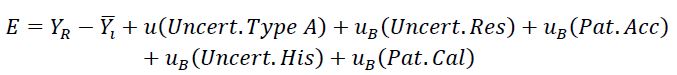 When applying equations (8) and (9) to the sphygmomanometer calibration process and considering both the sources of uncertainty and the mathematical model expressed in equation (1), we obtain equation (10).