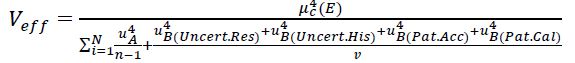 The estimate of the effective degrees of freedom of the standard uncertainty associated with the output estimate is obtained using the Welch-Satterthwaite formula.