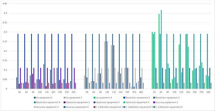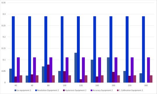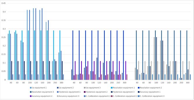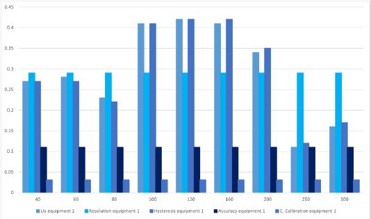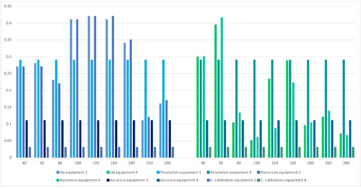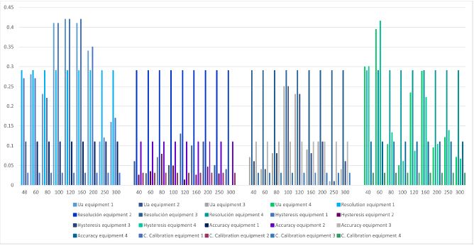 In figure 11, equipment 1, compared to equipment 4, presents a greater variation in the behavior of the data, since only in the last two points it does not present a high uncertainty due to repeatability and hysteresis. For equipment 4, it only occurs in the initial points and the two intermediate points. When comparing with the rest of equipment 4, it is observed that the uncertainty by team resolution predominates.