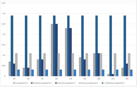 Thus, in figure 10, it can be observed that for equipment 1, the predominant uncertainty in most of the points is the equipment's resolution, followed by repeatability and hysteresis, while for equipment 2 and 3, the uncertainty prevails due to the team resolution at all points. According to the above, it can be inferred that equipment 1 had a greater variation in the data obtained compared to 2 and 3 as they had greater stability in the behavior of the data since the repeatability and hysteresis uncertainty is lower at most points. Comparing the 3, it is observed that the team with the greatest stability in the data is equipment 2 since in equipment 3, the uncertainty due to repeatability and hysteresis is greater at the points 100 mmHg and 120 mmHg than at the rest of the points.