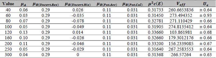 Table 10 and figure 6 are the sources of uncertainties that most contribute to the process. The uncertainty due to the sphygmomanometer's resolution predominates at 40 mmHg, 60 80 mmHg, 250 mmHg, and 300 mmHg. For the points 100 mmHg and 120 mmHg, the uncertainty that contributes the most is data repeatability and hysteresis for 160 mmHg and 200 mmHg. The uncertainty that contributes the most is due to the hysteresis of the sphygmomanometer.