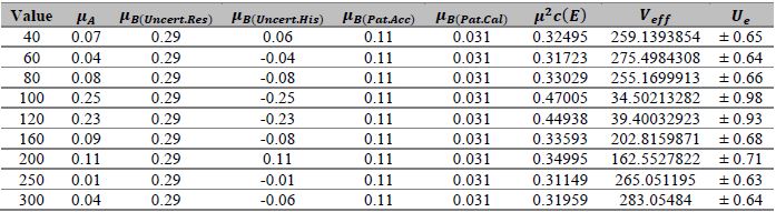 After obtaining the results in the measurement process, the uncertainty in the sphygmomanometer calibration process is estimated by applying equations (3), (4), (5), (6), (7), (10), (12), and (13) to the data in table 6, table 7, table 8, and table 9. The estimated expanded uncertainty for each measurement point is from 40 mmHg to 300 mmHg, expressed in the following tables.