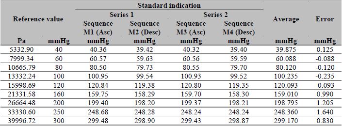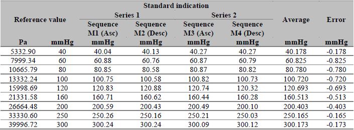 Measurements were taken as proposed in the method presented above, and the results are presented in the following tables. For each of the exercises, two series of ascending and descending sequences were performed. Finally, four (4) measurements were obtained, and the measurement error was calculated for each of the points. The measurement method and the points selected to carry out the calibration process were taken according to the laboratory experience, bearing in mind that the points encompass the physiological behavior of blood pressure since it includes points from healthy, hypertensive, or hypotensive patients. The number of points was considered according to the guidelines defined in DKD-R 6-1 [13], where it is established to perform the calibration in two sequences for each point (2 ascending and 2 descending) and at the maximum point of the equipment.
