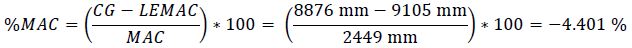 Through this estimate of the relation between %MAC with the CG in Equation 1, the CG desired will be forward of the main gear according to Equation 2. Consequently, to increase the longitudinal stability regarding the neutral point, it does not enter in stall during the landing and take-off by an induced moment. This condition would need external loads for a stable aircraft.