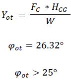 As parameter of empiric design, the trajectory of the wheel must be that the overturn angle would be into the next limit:[2]. For analysis it is associated with the distribution of the moment generated by two factors that can cause overturning: The centrifugal force in a ground turn and the drag force for cross-wing. The centrifugal force is defined by Equation 8 :