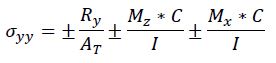 The tensile analysis of the component is obtained by the reactions and moments applied on the axial axis. There are stresses to direct compression and two bending moments that act perpendicularly to the axial axis for the stress applied to the tensile. Therefore, the absolute tensile stress on landing gear is the overlay of those stress evaluated in the cross-section of the study as is presented in Equation 14.