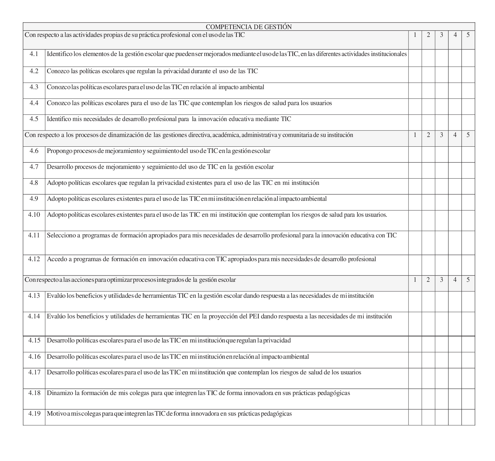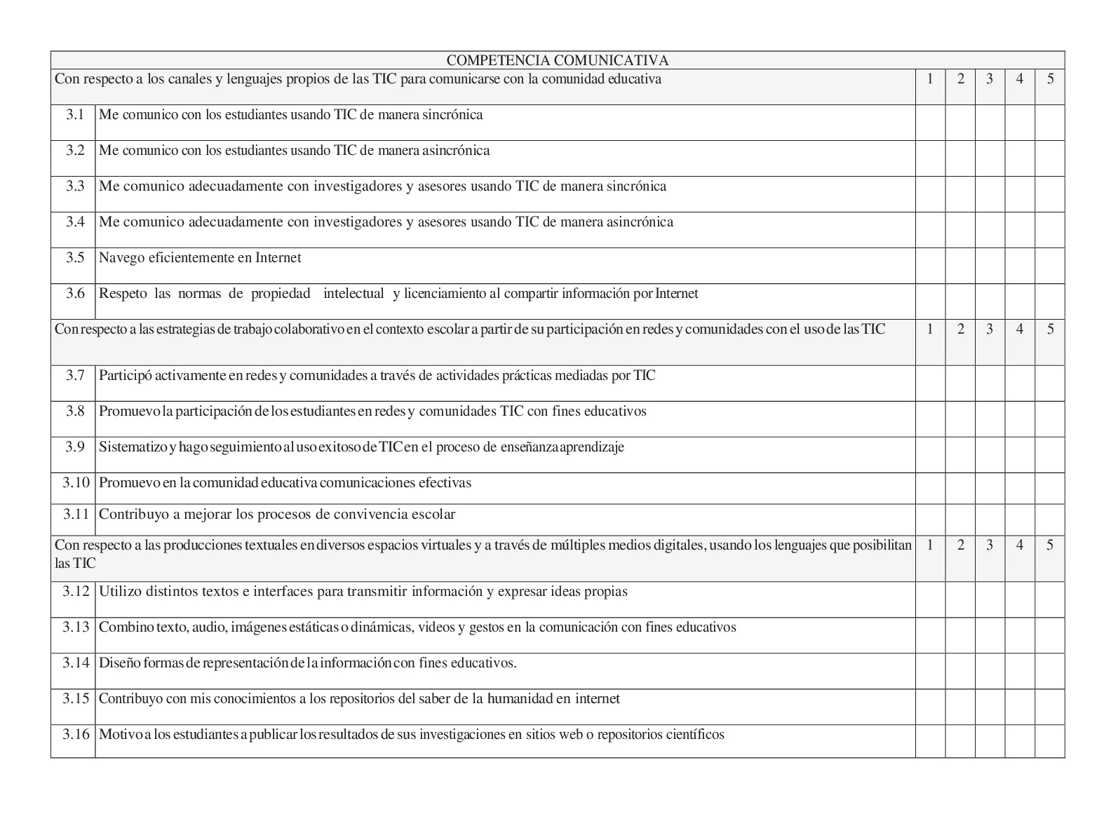Los docentes se autoevalúan como competentes en la competencia pedagógica, seguida de la tecnológica, por lo que se considera que hacen uso de los conocimientos pedagógicos y tecnológicos en el aula. Sin embargo, se ubican en un nivel bajo en la competencia comunicativa e investigativa, lo que evidencia la carencia de estos aspectos en su formación para hacer un uso más efectivo de las TIC. En un nivel intermedio de las puntuaciones se sitúa la competencia de gestión, lo que podría indicar que el uso de las TIC en los procesos de gestión académica, administrativa, institucional y de proyección social de la institución y la sostenibilidad de prácticas pedagógicas no sean tan innovadores como deberían ser.