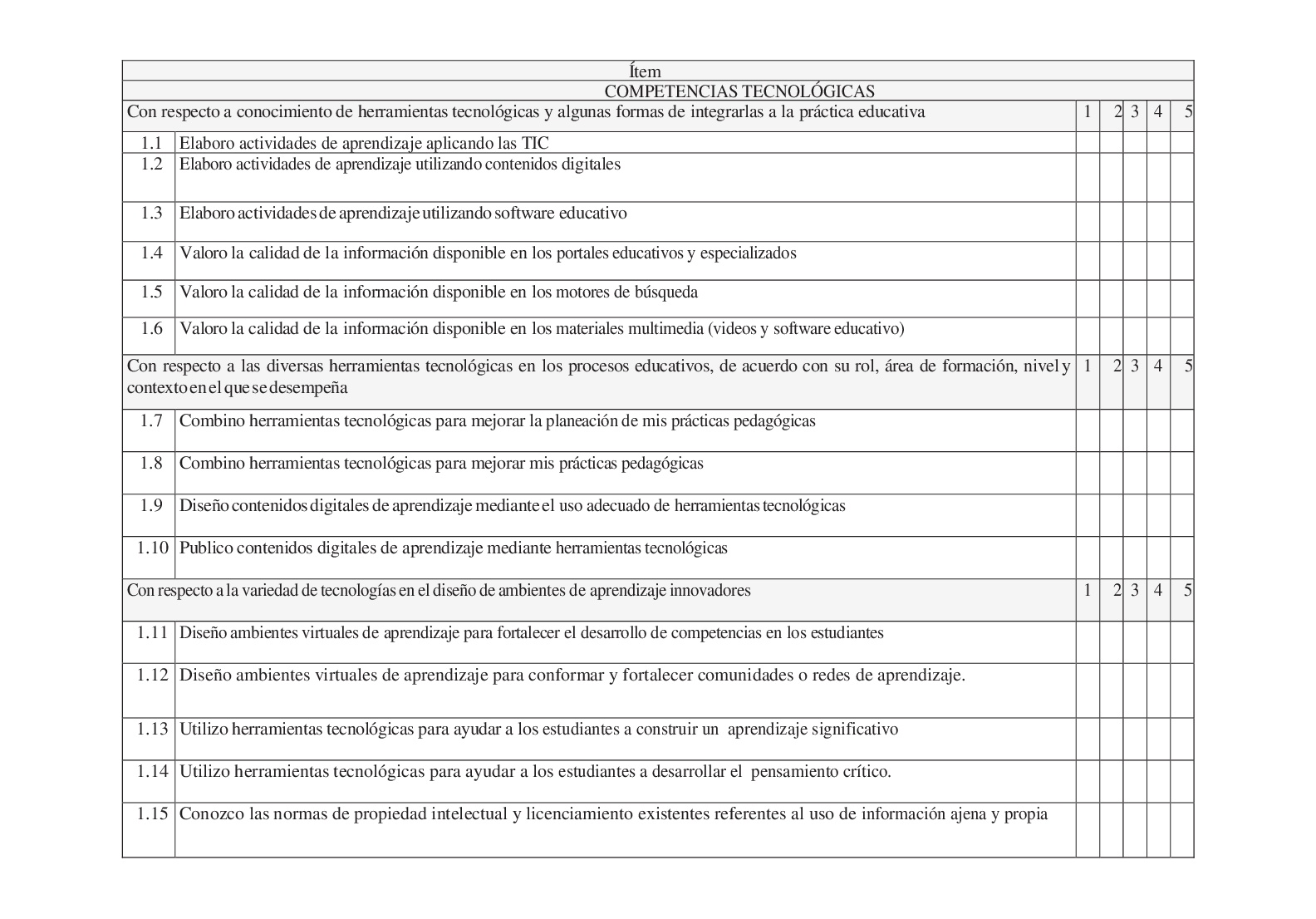 Como herramienta de recolección de datos se diseñó un instrumento que comprende en primer término los datos del perfil sociodemográfico de los docentes y en segundo lugar una escala tipo Likert con cinco opciones de respuesta: “nada competente” 1), “poco competente” 2), “competente” 3), “muy competente” 4), y “totalmente competente” 5), lo mismo que un conjunto de indicadores para cada tipo de competencias derivados directamente el documento Competencias TIC para el desarrollo profesional docente, del MEN de Colombia. El diseño del instrumento fue sometido a un proceso de validación a través del juicio de expertos hasta obtener su versión final. Posteriormente se realizó una prueba piloto calculando la consistencia interna de cada escala a través del Coeficiente Alpha de Cronbach, por dimensión, obteniendo los siguientes resultados: tecnológicas: 0,874 (15 ítems), pedagógicas: 0,950 (17 ítems), comunicativas: 0,906 (16 ítems), de gestión: 0,972 (19 ítems), investigativas: 0,953 (18 ítems) y total del instrumento: 0,976 (85 ítems). De estos datos se colige que los valores obtenidos avalan la alta confiabilidad del instrumento en todas las escalas que lo componen, y que oscilan entre 0,87 y 0,97.