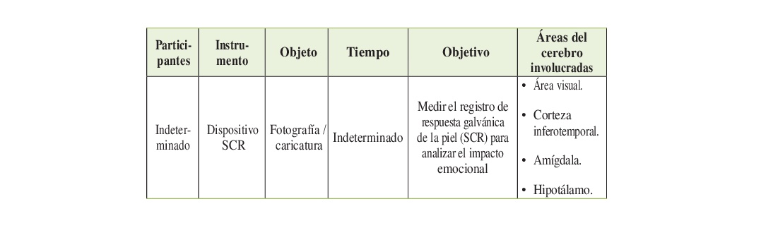El artículo de Rachamandran y Hirstein (1999)(Tabla 2) no presenta información de los participantes ni el tiempo de duración del experimento. Sin embargo, se logra determinar el dispositivo empleado para el análisis (Skin Conductance Response: SCR), el objeto de estudio (fotografía y caricatura), el objetivo y las áreas del cerebro que se activaron durante las pruebas.