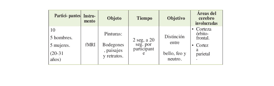 Para terminar, el experimento de Kawabata y Zeki (2004) confirmó que una persona puede tener diferentes niveles de activación cerebral frente a una pintura y presentar actividad en diferentes áreas de la corteza cerebral. En consecuencia, se puede colegir de manera parcial que la intención de escoger una pintura de acuerdo con el criterio de bello, feo y neutro implica una lectura compleja, un trabajo intelectual que determina el concurso de diferentes zonas de la corteza para llevar a cabo el juicio.