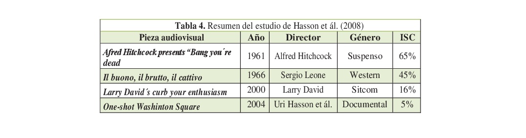 Hasson et ál. (2008) llevaron a cabo un estudio para determinar qué ocurría en el cerebro de un grupo de espectadores que observaban seis piezas audiovisuales y una sonora. Los ejercicios se diseñaron para evaluar la manera en que el espectador percibe el sonido, los centros de fijación ocular en la pantalla, la alteración del orden de la narración fílmica, etc. El conjunto de experimentos tenían el objetivo de analizar en un grupo de cincuenta participantes a qué nivel coincidía el índice de correlación entre-sujetos (Inter Subject Correlación: ISC). Como se explicó antes, el ISC es un protocolo que permite evaluar en un conjunto de espectadores qué película gustó más y cuál menos. Asimismo permite distinguir en un filme qué partes causaron mayor o menor impacto emocional. Las medidas se cotejan y se puede determinar en la línea de tiempo de la pieza audiovisual en qué instantes hubo coincidencia en la mayoría del público. El examen se realizó con la ayuda de un dispositivo fMRI (functional Magnetic Resonance Imaging) para examinar y medir las áreas del cerebro que se activan durante la observación del filme. Los objetos de estudio fueron las películas Il buono, il brutto, il cattivo (Leone, 1966), City Lights (Chaplin, 1931), The aventures (Chaplin, 1917), un capítulo de la serie de televisión Alfred Hitchcock presents “Bang you´re dead” (1961), un capítulo del show de televisión Larry David´s curb your enthusiasm (2004) y el audiolibro Alice’s Adventures in Wonderland. Además, produjo un filme con una toma única sin planificar ni editar que Hasson et, al (2008) denominaron: One shot of Washinton Square.
