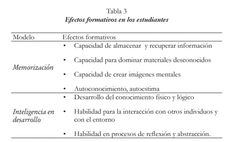 En la tabla 3 se muestran los efectos formativos que se pueden lograr en los estudiantes según los modelos de enseñanza Memorización e Inteligencia en desarrollo.