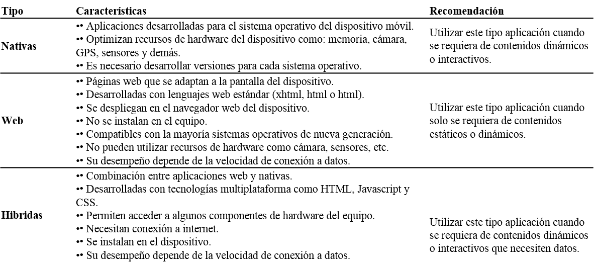 Existen varios tipos de aplicaciones que se pueden desarrollar para dispositivos móviles. La elección del tipo de aplicación dependerá de la necesidad que se desea cubrir, de la estrategia pedagógica y de los recursos de hardware de los dispositivos móviles de la institución educativa. La elección del tipo de aplicación determinará el cronograma, pues los tiempos de desarrollos son diferentes para cada tipo de aplicación.