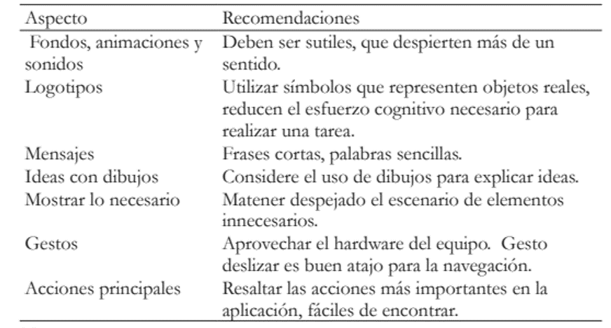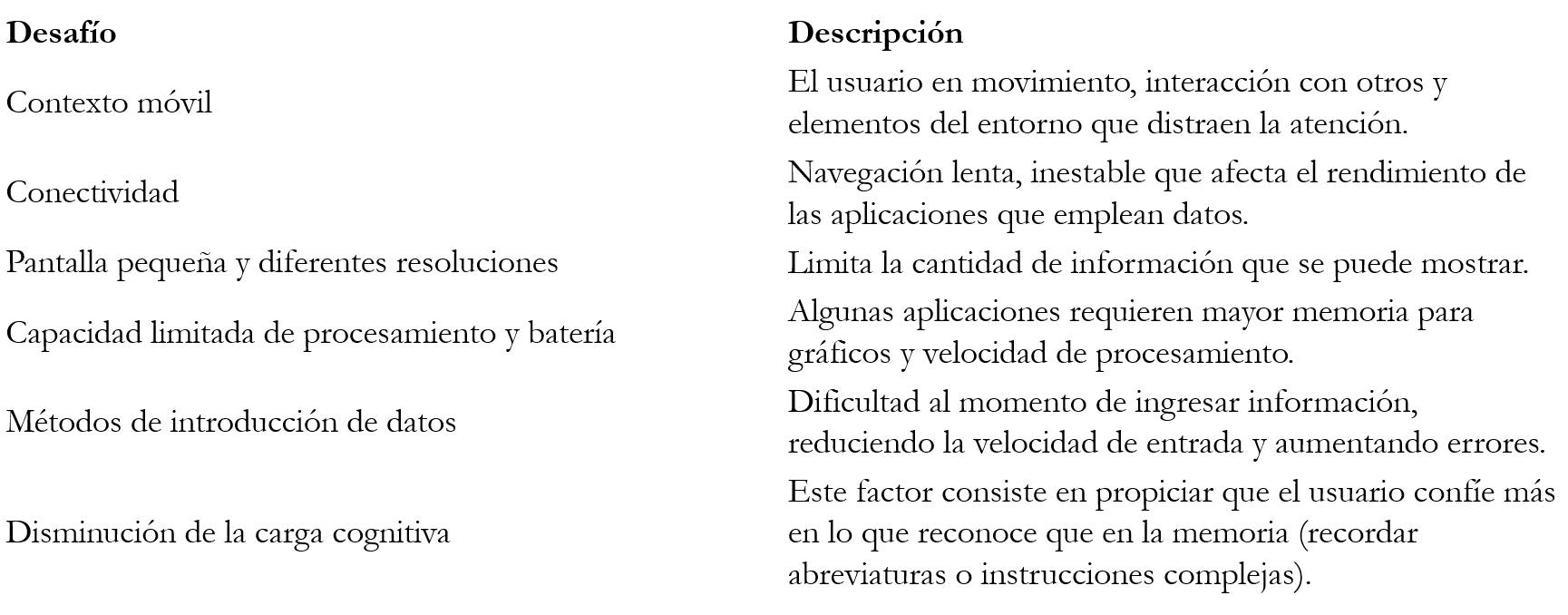 El éxito de dispositivos móviles como teléfonos inteligentes y tabletas es motivado por el buen diseño de las aplicaciones y por la facilidad de uso que aporta la interfaz táctil, que permite al usuario interactuar con el dispositivo sin necesidad de periféricos de entrada. En el proceso de diseño de la aplicación educativa móvil, además, de los aspectos pedagógicos, metodológicos y estéticos, se debe tener en cuenta que el contexto de uso cambia continuamente, pues nada garantiza que el individuo permanezca estático en un solo lugar. La tabla 7 muestra algunos desafíos de usabilidad que deben ser asumidos a la hora de diseñar aplicaciones para móviles.