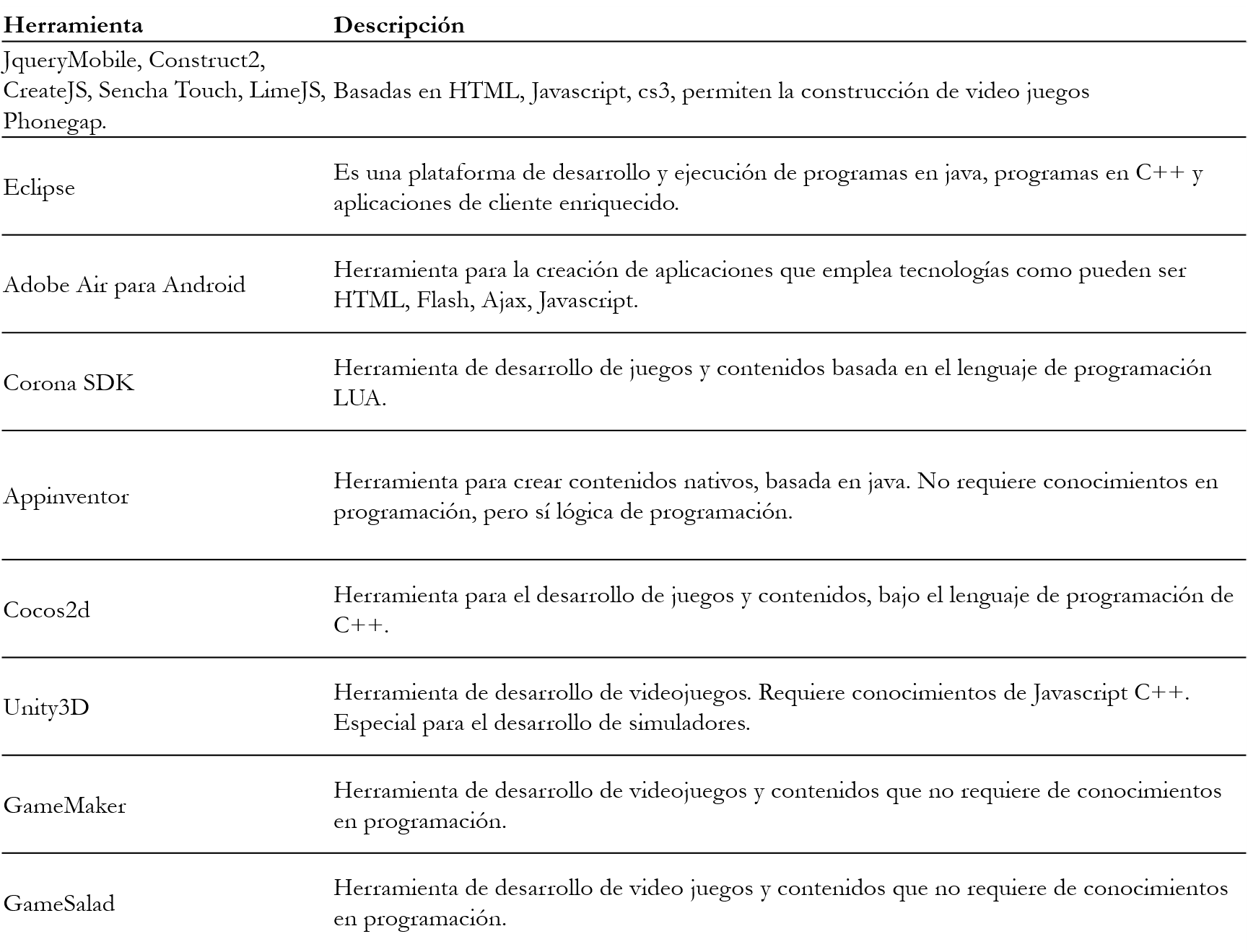 La tabla 10 muestra algunas herramientas para el desarrollo de aplicaciones móviles que los equipos pueden tener en cuenta, para evitar una curva de aprendizaje alta que afecte el desarrollo del proyecto.