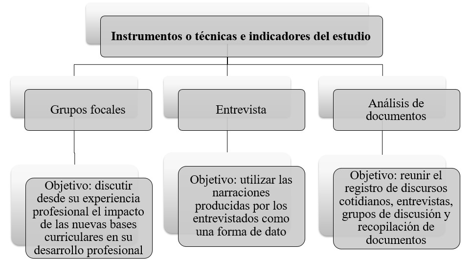 Los criterios de inclusión y exclusión son: docentes de educación básica con título profesional, con dos o más años de experiencia en docencia, profesionales que ejercen con más de ocho horas pedagógicas, pertenecientes a la FDMA y residentes en la IX región de La Araucanía. Las técnicas e instrumentos aplicados, y los objetivos se muestran en la Figura 1. Además, se aplicó la triangulación —metodológica e intermetodológica— como procedimiento de investigación para la comprensión hermenéutica de los resultados.