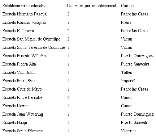 Como ya se ha mencionado, esta investigación se sitúa en el contexto de quince escuelas rurales multigrado de la FMDA, de las que participan veinte profesores. Dichos establecimientos educacionales están ubicados en los sectores rurales de las comunas de Padre las Casas, Vilcún, Freire, Puerto Saavedra, Toltén, Melipeuco, Puerto Domínguez y Villarrica, que abarcan la geografía comprendida desde cordillera hasta la costa.