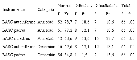 En la muestra se identificó al 21% de estudiantes con ansiedad, percepción similar a la de los padres, pero difiere con la descripción de los maestros, los cuales consideran a un 35% de estudiantes con esta problemática. Los estudiantes identifican los síntomas de depresión en el 30%, a diferencia de sus padres que lo hacen en el 15%, y se sienten estresados el 23%. Esto puede ser el resultado de estimulación ambiental que agobia al estudiante al ser híper o hiposensible, además de las dificultades que tiene para ubicar y comprender información y retroalimentar con acciones inadecuadas que pueden ser castigadas y generan angustia, tristeza o estrés, como lo advierten Bar-Shalita al. (2008) y Pérez (2012).