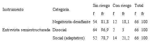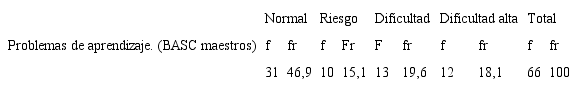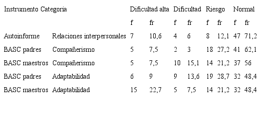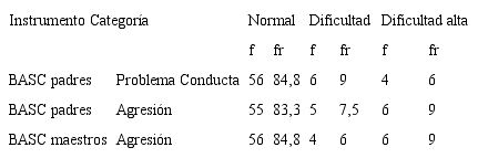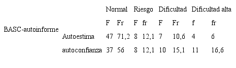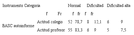 Las variables afectividad y conducta también se evaluaron con BASC, que mide dos dimensiones definidas en escalas: 1) la escala clínica, que mide hiperactividad, agresión, problemas de la conducta, ansiedad, depresión, somatización, atipicidad, aislamiento y problemas de atención; y 2) la escala adaptativa, que mide adaptabilidad, habilidades sociales y compañerismo. El instrumento tiene escalas para el estudiante, denominado autoinforme —8-11 años—, y BASC para padres y profesores, con validez del 85% en Colombia. Se complementó con la entrevista semiestructurada de padres (Zuluaga, 2007) para conducta disocial, oposicionista-desafiante y afectivas como depresión y ansiedad.
