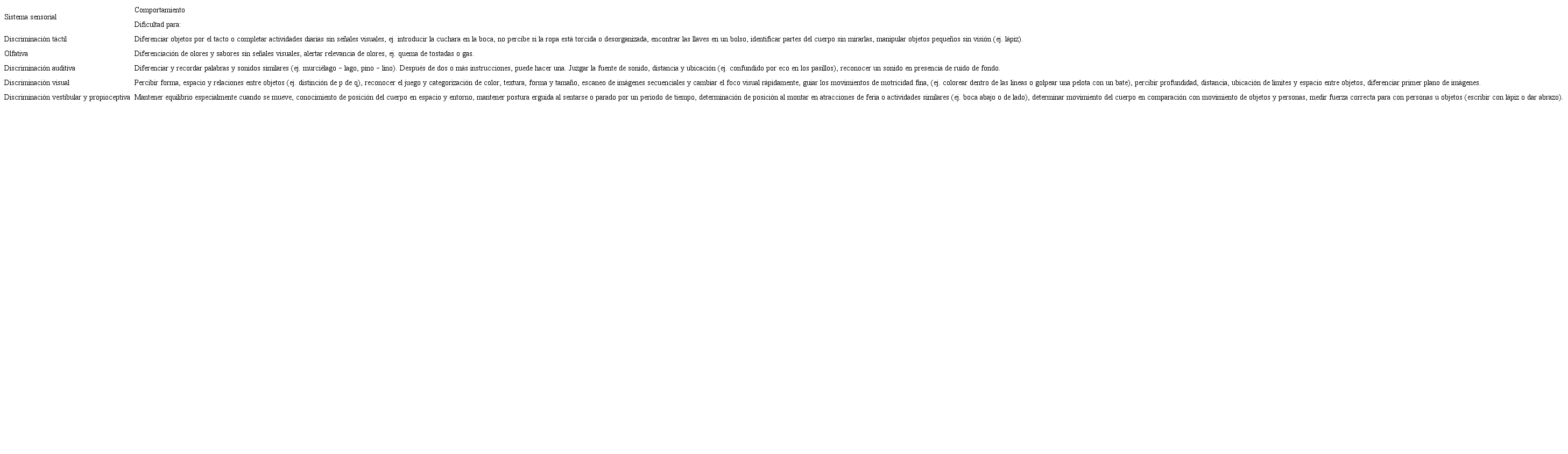 El trastorno de discriminación sensorial es la dificultad que tiene el cerebro para recibir y discriminar estímulos de sistemas sensoriales exteroceptivos —vista, audición, tacto, gusto, olfato, vestibular, propioceptivo— e interoceptivos (Cohn, May-Benson & Teasdale, 2011; Pollock, 2011; Lázaro, 2008) que afecta la percepción de totalidad —figura, forma y fondo— y la organización e integración de estímulos de estructuración de realidad —táctil-propioceptivo, táctil-visual, táctil-olfativo-gustativo, vestibular-propioceptivo, vestibular-visual, vestibular-auditivo, auditivo-visual— (Hanft, Miller & Lane, 2000; Medel & Vásquez, 2007). Un ejemplo son los niños con deficiencia visual e integración de información vestibular y propioceptiva, los cuales alteran la organización del espacio, grafía, orden, vestimenta, orientación, secuencias y resolución de problemas (Imperatore, 2005; Polatajko, Law, Miller, Schaffer & Macnab, 1991; Tudela, Abad & Tudela, 2017).