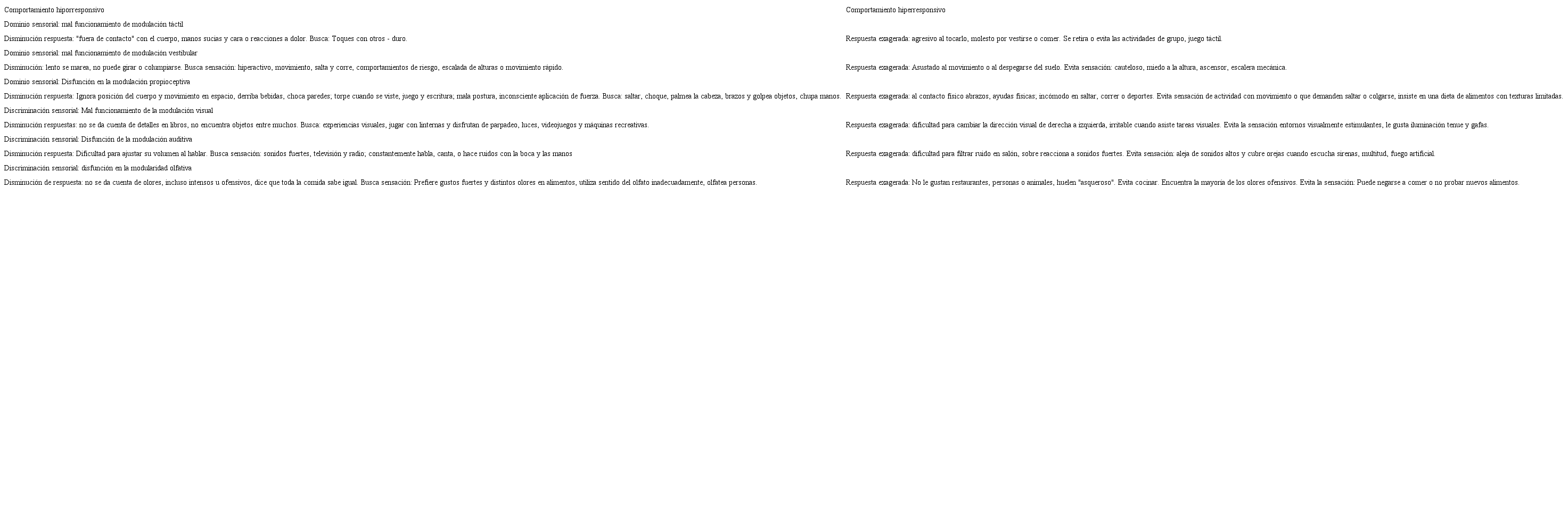 El trastorno de modulación sensorial [TMS] es la incapacidad para regular los diferentes umbrales activos producidos en los sistemas sensoriales, estructurando problemas para definir información relevante, aprovechar recursos cognitivos, organizar y resolver problemas (Bar-Shalita, et al. 2008; Cohn & Cermark, 1998). Su expresión se clasifica en tres subtipos: a) hiporresponsivo, caracterizado por la baja reactividad sensorial, pasividad, inatención, problemas de discriminación auditiva y visual, problemas de aprendizaje, torpeza motriz y necesidad de estímulos intensos para iniciar una actividad; b) hiperresponsivo, es hipersensible a cualquier sistema sensorial, abrumando a la persona psicológicamente y utilizando estrategias para su regulación como, receloso-cauteloso —evitación estímulo— y negativista-desafiante —oposicionista, agresivo y humor negativo— (Erazo, 2016; Pérez, Ballabriga, Doval & Caldeira, 2011); y c) buscador sensorial, es hiporresponsivo, pero destaca la necesidad de estimulación vestibular, que lo lleva a moverse constantemente, saltando, gritando, corriendo y dando vueltas, con el objetivo de aumentar el input sensorial, con deficiencias en atención, memoria de trabajo, funciones ejecutivas (Artigas, 2003) y en inhibición sensorial, cognitiva y conductual, (Cohn, et al. 2011; Mangeot, Miller, McIntosh, McGrath-Clarke, Simon, Hagerman & Goldson, 2001).