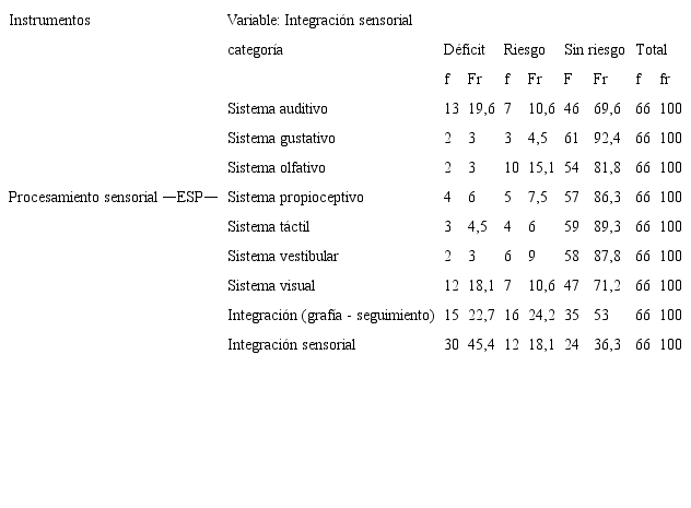 Abstract: Sensory integration is a neuropsychological process which allows an appropriate processing of information, with implications for cognitive functionality, learning, affectivity, and behavior. Its deficiency affects 35% of students in South America and its complex presentation confuses professionals who seek to classify it. For this reason, a study with a quantitative approach is constructed; it describes the variables of sensory integration, learning, affectivity, and behavior in a non-probabilistic sample of 66 students between 7 and 10 years old from a public school. The results confirm the existence of a sensory integration problem in 46% of people, difficulties in learning to read of 58% and in learning calculus of 93%, anxiety of 20 and 35%, depression between 15 and 31%, and behavioral problems of 15%, for which identification and intervention programs in schools are required.
