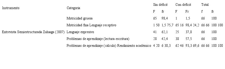 La variable aprendizaje y procesos neuropsicológicos se evaluó con la entrevista semiestructurada para trastorno deficitario de atención con hiperactividad [TDAH] de padres de la sublínea de investigación en TDAH de la Universidad de Manizales, creada por Zuluaga (2007) y utilizada en su tesis doctoral, la cual permite la valoración de categorías complementarias, como el lenguaje —receptivo/expresivo—, motricidad —gruesa/fina—, aprendizaje —lectura/cálculo— y rendimiento académico. Se complementó con la escala para valoración de aprendizaje de instrumento para maestros de la escala del sistema multidimensional para la evaluación de la conducta —Behavior Assessment System For Children [BASC]— de Reynolds y Kamphaus (1992, citado en Zuluaga, 2007; Puerta, 2004).
