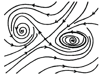 Finalmente, rodeando la fuente, a la derecha, hay un bucle que se cierra una sola vez. Este es un ciclo límite. Se parece a un remolino, donde el fluido gira y gira. Los flujos en el plano poseen estas características. Puede que haya más de una de estas características, pero no se encontrará nada más complicado (Nápoles, 2004).