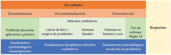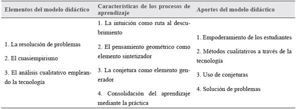 Una vez enunciados aquellos aspectos considerados como deficiencias del proceso enseñanza-aprendizaje de las ecuaciones diferenciales, se establecieron los fundamentos para nuestro modelo didáctico. La propuesta cuenta con tres elementos articuladores: solución de problemas (Polya, 1981), enfoque cuasiempírico de las matemáticas (Lakatos, 1978) y la teoría cualitativa de las ecuaciones diferenciales (Delshams, 2004), que se implementa apoyada en el uso del software.
