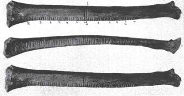 Uno de los registros más antiguos hasta ahora descubiertos es el hueso de un babuino con 29 muescas -35 000 a. C.- y fue encontrado en África. Aproximadamente de la misma fecha, en la República Checa se encontró el hueso de un lobo con 55 muescas, divididas en dos grupos, uno de 30 y el otro de 25 (Barrow, 2012; Ifrah, 1987; Mankiewicz, 2005). El hueso de Ishango -20 000 a. C.- (figura 1), registro de gran importancia en la historia de las matemáticas, fue encontrado en la ribera del lago Edward en África Central.