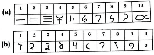 A mediados del siglo VI d. C, según Castillo (2011) y Gómez (1993), la genialidad de los hindúes y su pasión por los números los llevó a conformar el sistema numérico Kharosthi, un sistema numérico posicional en base diez. Este sistema evolucionó gradualmente hasta la numeración Brahmi (figura 13a), la cual estaba conformada por diferentes símbolos del 1 al 10 y potencias superiores, sin contar de momento con la presencia del cero (Gutiérrez, 2009; Mankiewicz, 2005). Al rededor del 876 d. C., estos numerales evolucionaron hasta conformar el sistema Gwalior (figura 13b). Algunos registros de este sistema se encontraron en un templo de la fortaleza hindú de la ciudad de Gwalior, al noroeste del estado de Madhya Pradesh. Estaba formado por diez símbolos en los que se incluía un óvalo que representaba el número cero, muy similar al usado actualmente (Castillo, 2011; Webb, 2015).