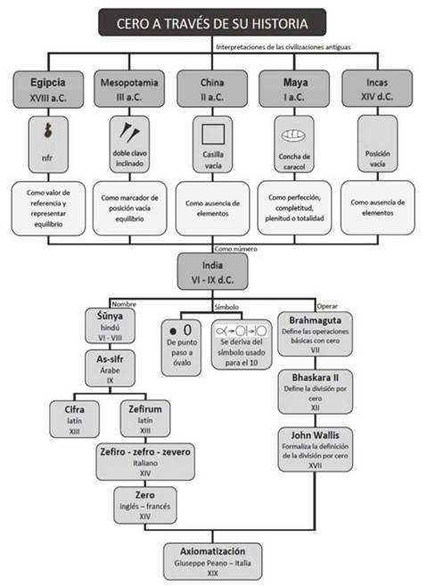 El recorrido histórico del cero por algunas civilizaciones, los significados, símbolos y nombres que le atribuyeron se observan en la figura 15, en la que se sintetizan algunas contribuciones para su interpretación en diferentes contextos.