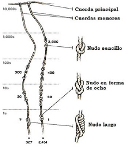 Continuando con las civilizaciones en América, cabe resaltar las concepciones numéricas desarrolladas por los incas en Perú, que a falta de un método escrito para registrar cantidades, emplearon cuerdas de varios colores y diferentes nudos para llevar sus registros contables (figura 9). El quipu, como se conoce, era un método muy efectivo en el que no era necesario emplear símbolos elaborados para el registro de cantidades. Era usado exclusivamente por un oficial de nudos, llamado quipu-camayoc, quien era el encargado de registrar y conservar cualquier información contable (Burton, 2011; Fedriani & Tenorio, 2004; Schmidt & Santos, 2016).