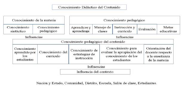 Los profesores consolidados en el saber sustantivo están desarmados para verificar las transformaciones internas de la investigación en las disciplinas científicas de las que han apropiado el conocimiento que dominan. El CDC da cuenta del saber docente. Ese saber explicitado se ejemplifica en el análisis de Park y Oliver (2008), desde el modelo de Shulman, al proponer las relaciones entre el conocimiento de la materia, los conocimientos pedagógicos y el conocimiento sintáctico, que establecen los encuentros de saberes en la práctica docente del CDC, según el contexto y la influencia externa a la formación docente. En la figura 1 se presenta una estructura de los conocimientos que propone el CDC de Park y Oliver y que funcionan como categorías de análisis para la presente investigación.