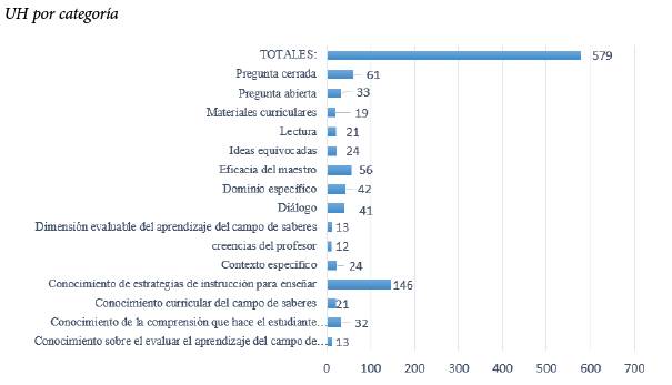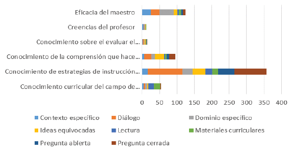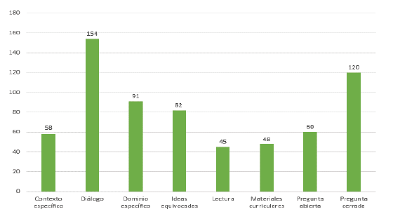 El análisis nos permite indicar, a partir de la gráfica 1, que las subcategorías pregunta abierta y pregunta cerrada -categorías emergentes del análisis- junto con lectura y diálogo aparecen de manera predominante. El uso recurrente de la pregunta cerrada advierte la necesidad de que los estudiantes den cuenta de cuestiones precisas del saber impartido - tal vez por el uso mismo del texto-. Por otro lado, la gráfica nos ilustra cómo la eficacia del maestro y el conocimiento de la comprensión que hace el estudiante del campo de saber adquieren también un lugar significativo en el desarrollo de las clases.