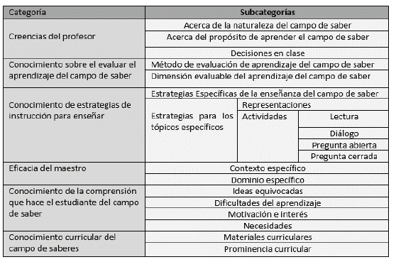 Park y Oliver proponen como categorías de análisis: orientations to teaching science1, knowledge of students understanding in science2, knowledge of science curriculum3, knowledge of instructional strategies and representations for teaching science4, knowledge of assessment of science learning5 y teacher efficacy6. El CDC ofrece categorías de análisis, sin embargo, el saber que se construye en el hacer del docente, en la formación, no se reduce a las categorías establecidas por lo planteado en el modelo de CDC, pues los investigadores docentes pueden dar cuenta de nuevas categorías no contempladas por el modelo de Park y Oliver (2008).