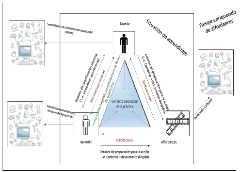 Como la cita anterior lo muestra, el asunto es que un enfoque ecológico de la cognición humana es viable sobre la base del reconocimiento del aspecto normativo de la acción (Rietveld, 2008), que implica marcos de interacción sociocultural que transforman el entorno determinado, el arreglo y la organización de lugares y momentos socialmente fijados para el despliegue. El aspecto decisivo para entender el desarrollo de la cognición de alto nivel -y por lo tanto el aprendizaje en el ámbito académico- es el desarrollo de la sensibilidad de los participantes para interactuar en su contexto con una miríada de affordances (Rietveld & Kiverstein, 2014) que suscitan su actividad cognitiva: