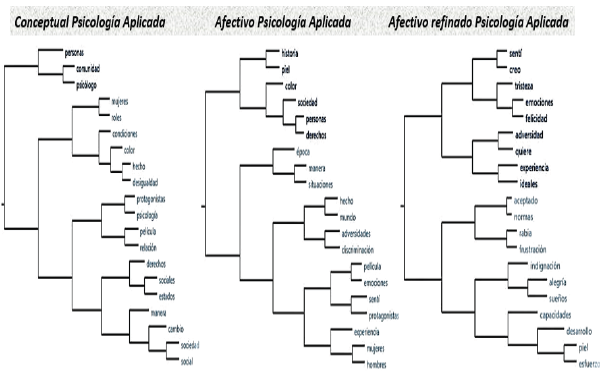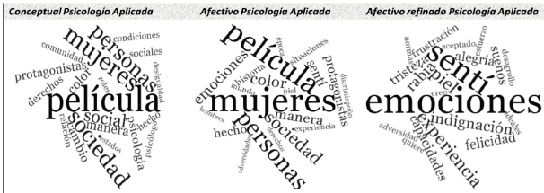 Como puede verse, según las ideas del SIF, los textos conceptuales de las personas del grupo de psicología aplicada incluyeron términos que reconocen directamente las solicitaciones de la obra de cine -película, mujeres, protagonistas, etc.- y, por otra parte, palabras que pueden relacionarse más bien con los estados de preparación vinculados a la práctica educativa de quienes se preparan como psicólogos profesionales para identificar problemas psicosociales -personas, psicólogo, comunidad, etc.-.