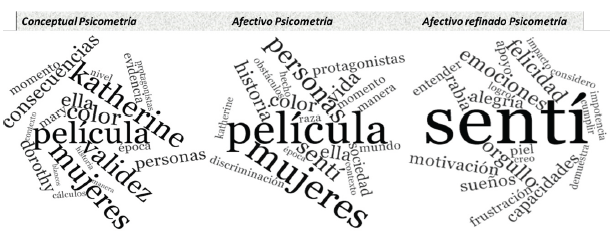 La nube de palabras del texto afectivo entre los estudiantes de psicometría (la segunda de la figura 4) presenta un patrón consistente con lo que se ha dicho hasta aquí: los participantes produjeron un texto escrito concordante con el asunto que debían estudiar desde un punto de vista conceptual -obstáculos, manera, contexto, etc.-, en el que se presentan estados de preparación para la argumentación solicitada -sentí, vida-. La actividad de refinamiento practicada -selección de las palabras que expresan estados de preparación para la acción- (nube 3 de la figura 4) permite asociar claramente las emociones descritas por los participantes dentro del SIF -sentí, alegría, apoyo, motivación, etc.-. Se trata, en este caso, de la evaluación positiva del comportamiento orientado al logro por parte de las protagonistas de la película: