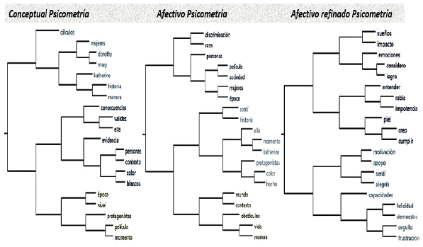 La figura 4 sintetiza los patrones de respuesta en el caso de los estudiantes de psicometría bajo la misma metodología usada para el grupo anterior. Como puede verse en la primera nube -conceptual-, los términos repetidos muestran que las solicitaciones captadas por los participantes en el filme atienden más a los personajes considerados de manera individual -Katherine, Dorothy, Mary, etc.-, pero, de nuevo, igual que en el caso precedente, se pueden encontrar diversas palabras directamente relacionadas con el tema académico con el que el participante está directamente involucrado -cálculos, evidencia, consecuencias, nivel, etc.-. Así pues, mientras el SIF de los estudiantes de psicología aplicada genera respuestas que tienden a enfocarse en problemáticas sociales, el SIF de los estudiantes de psicometría genera respuestas que tienden a enfocarse en las consecuencias del comportamiento de los protagonistas considerados de manera individual.