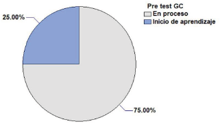 La distribución de los niveles en el postest mostró que, en el caso del GE, todos los niños se ubicaron en el nivel logrado -100%-. Sin embargo, en el caso del GC, como se observa en la figura 3, el 75 % se ubicó en el nivel en proceso y 25 % en nivel inicio del aprendizaje.