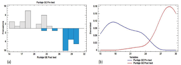 En la figura 5 (a) se observa que las distribuciones de las frecuencias en el pretest se ubican en lo más bajo de la escala, es decir entre las calificaciones menores a 25. Por el contrario, en el postest la distribución de frecuencias se acumula hacia los puntajes mayores, es decir, entre 27 y 30, lo que demuestra la diferencia entre ambos test. En la gráfica de comparación de las densidades suavizadas (b), se nota claramente cómo en el pretest las mayores densidades -de acuerdo con las calificaciones- se acumulan en los puntajes menores de la escala y van disminuyendo a medida que se avanza en la misma. Por el contrario, en el postest las calificaciones se acumulan más densamente en lo alto de la escala de medida y disminuyen hacia los niveles más bajos. Lo anterior indica que las diferencias en las distribuciones se deben a un aumento significativo en las calificaciones del GE luego de la intervención con los talleres de diseño shipibo-conibo.