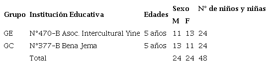 La investigación se desarrolló con un enfoque cuantitativo y descriptivo. Se centró en aspectos observables y susceptibles de cuantificar con el uso de la metodología empírica analítica. Se utilizaron pruebas estadísticas para el análisis de datos. La muestra estuvo integrada por 48 niños de cinco años pertenecientes a la comunidad shipibo-conibo, quienes son estudiantes regulares de las instituciones educativas del nivel inicial N°470-B de la Asociación Intercultural Yine y N° 377-B Bena Jema del distrito de Yarinacocha, Provincia Coronel Portillo, Región Ucayali, Perú, durante el 2019. La muestra fue escogida de forma no probabilística y por conveniencias, ya que el nivel inicial en el ciclo II cuenta con niños de 3 a 5 años, de los que solo se escogieron los de 5 años. La muestra fue dividida en dos grupos de 24 niños: un grupo control (GC) y un grupo experimental (GE), que se formaron mediante asignación al azar de los sujetos. Para la medición de la NE, se aplicó una guía de observación que consistió en un listado de ítems por aspectos que orientan en la observación del desarrollo de la NE de los niños y niñas de cinco años. Este instrumento contenía 30 ítems, en escala: sí = 1 y no = 0 puntos. En la tabla 1, se muestran las características de la muestra estudiada.