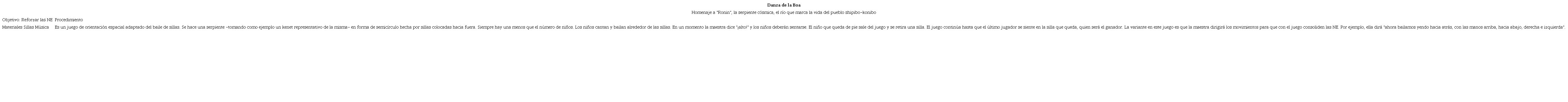 El GE fue sometido a una intervención en la institución por treinta minutos durante una semana, mediante talleres de kenebo shipibo-conibo, ajustados a la planificación del docente, los cuales se enfocaron en diferentes actividades tales como pintura, dibujos, mapas, canto y juegos. Los juegos de reconocimiento del espacio buscan ayudar al niño a descubrirlo y enunciarse en él. En este sentido, en la tabla 2 se describe uno de los juegos utilizados, llamado la Danza de la Boa. El resto de las actividades fue realizado con diferentes kenebos como guía. Prevalecieron los juegos dirigidos por los docentes en los que estos diseños se asemejan a los juegos de la población shipibo-conibo, con los cuales los niños reconocen delante, detrás, izquierda y derecha.