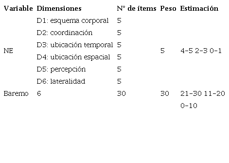 Para la medición de la NE, se aplicó una guía de observación. Se desarrollaron seis dimensiones de la NE, cada una con cinco ítems respectivamente: