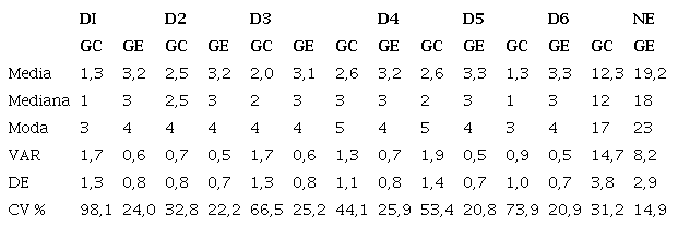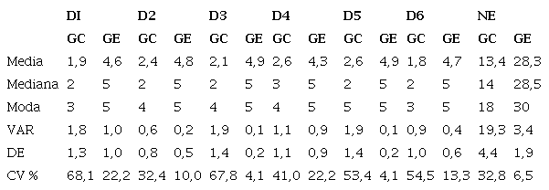 En general, las dimensiones medidas en el GC mostraron valores promedio entre 1 y 3, lo que indica, según el baremo establecido, que los niños están inicialmente en el rango entre inicio y en proceso de aprendizaje de las NE, lo que se corrobora con el valor medio de la variable, el cual estuvo en el rango correspondiente al nivel en proceso de aprendizaje. En el caso del GE, las dimensiones presentaron valores medios aproximados de 3, lo que significa que inicialmente este grupo está en el nivel correspondiente a en proceso de aprendizaje de las NE, lo cual se observa también en la variable total, cuya media se ubicó entre 11 y 20. En ambos grupos el puntaje que más se repitió -moda- en las dimensiones se ubicó mayormente en 4, lo que indica que, si bien -en general- los grupos están en proceso de aprendizaje, existe un porcentaje importante de niños con NE logrado inicialmente. La desviación estándar, la varianza y el coeficiente de variación indican que existe mayor variabilidad de los puntajes en el GC, en comparación con el GE.