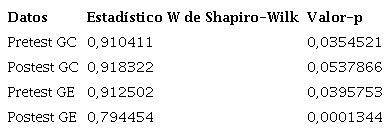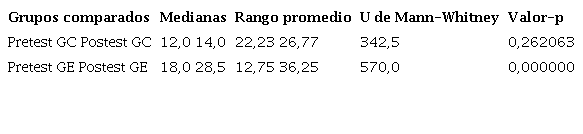 Como se observa, con excepción de los resultados del postest del GC, los demás resultados presentan valores p < 0,05, lo que indica que se puede descartar la hipótesis de que los datos provienen de una distribución normal. Aun cuando los resultados del postest GC tienen valor p > 0,05, están bastante cerca de este valor límite. Además, no se pueden aplicar pruebas paramétricas, ya que solo serían aplicables a esta muestra e invalidarían los demás. De acuerdo con lo anterior, se aplicaron pruebas de comparación no paramétricas, las cuales son aplicables a todos los resultados obtenidos. En la tabla 7 se muestra la comparación de medianas con la prueba U de Mann-Whitney, con nivel de confianza de 95 %.